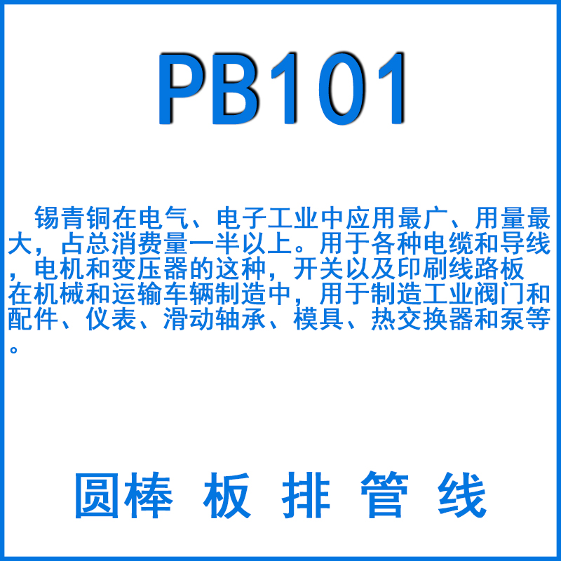 Pb101錫青銅有高的力學(xué)性能、耐腐蝕性和高彈性,能很好地在冷態(tài)下承受壓力加工,也可在熱態(tài)下進(jìn)行壓力加工。Pb101多用制作各種壓力計(jì)用管材料。
