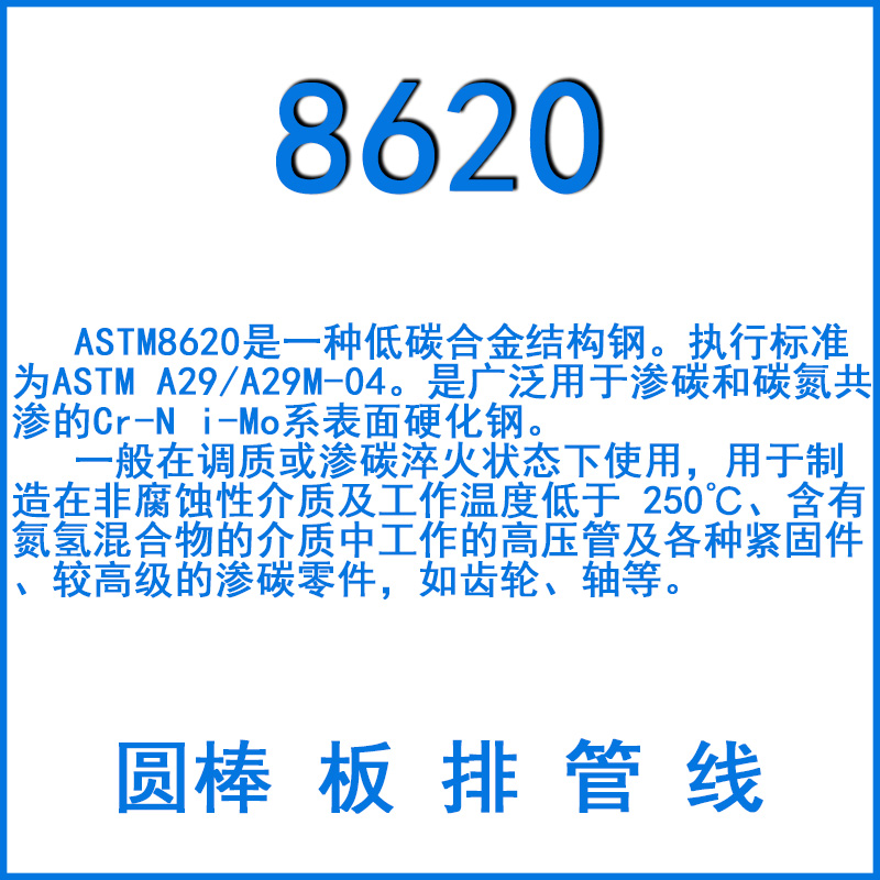 ASTM8620是一種低碳合金結(jié)構(gòu)鋼。執(zhí)行標(biāo)準為ASTM A29/A29M-04。是廣泛用于滲碳和碳氮共滲的Cr-N i-Mo系表面硬化鋼。