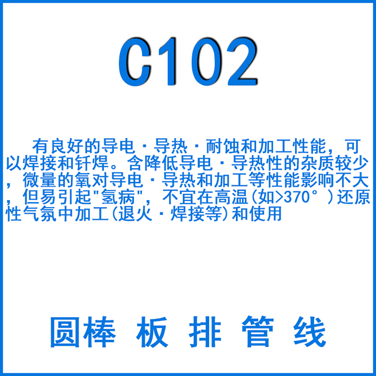 有良好的導電.導熱.耐蝕和加工性能,可以焊接和纖焊。含降低導電.導熱性的雜質較少,微量的氧對導電.導熱和加工等性能影響不大,但易引起"氫病",不宜在高溫(如>370°)還原性氣氛中加工(退火.焊接等)和使用